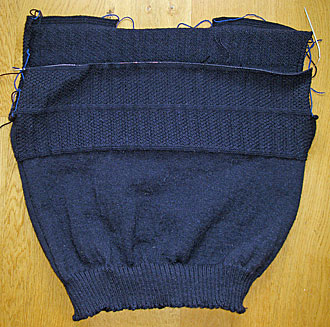 I’ve deliberately coordinated the way I knit each row. Because I’m knitting back and forth, that means I knit one row with the front side facing towards me, and the next with the reverse facing towards me. Now, because the pattern calls for alternating plain knit rows and pattern rows of knit 2/purl 2, I’ve arranged it so that each knit row comes when the front is facing towards me – so I can actually knit it with a row of knit stitches, which is faster and easier than purl stitches for me; while the pattern row – which would be the same effectively whichever way it was facing – comes on the reverse side. (Clever, eh? Well, not really, but it makes quite a difference over 8 inches of patterned yoke.)