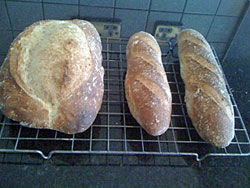 I’m beginning to think I’ve finally found my vocation as a baker! (I could try couriering some to you by overnight delivery, but it may not be an economically viable model…) Warm bread fresh from the oven is the best – one of the mini-baguettes is my usual ration, and baguettes were made to be ripped apart in chunks and devoured instantly. I’m told that bread itself is not fattening, it’s the butter and spreads that go on top that add the calories – and I’m lucky in that I love the taste of fresh bread so much I don’t put anything on it. So it’s just flour, water, salt and yeast, accompanied by the faint ghostly echoes of imaginary strawberry jam, cheese and pickle, and lashings of hot butter…