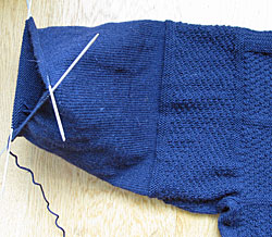 The other thing to bear in mind at this stage is constantly to change the join points between the double-pointed needles. If you always have the join points between needles at the same places you end up with 3 columns of uneven stitches (or at least I do, since I tend to knit the join stitches at a slightly different tension to the rest of my stitches, try as I might). But if I do as the books say, and move it along by one stitch per row, I replace the columns with 3 diagonal scars running round the sleeve. So my solution is to knit 3-7 rows with the joins in the same place, then move them on by 5-10 stitches, varying the amounts randomly in an attempt to fool the eye. It’s my knitting equivalent of soldiers breaking step to march over a bridge.